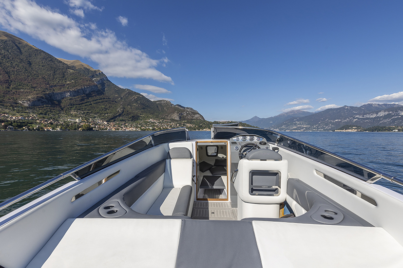 Il parabrezza avvolgente non è solo un elemento estetico distintivo, ma è progettato per garantire il massimo riparo al pilota, integrandosi in perfetta armonia con il design filante dell’imbarcazione.